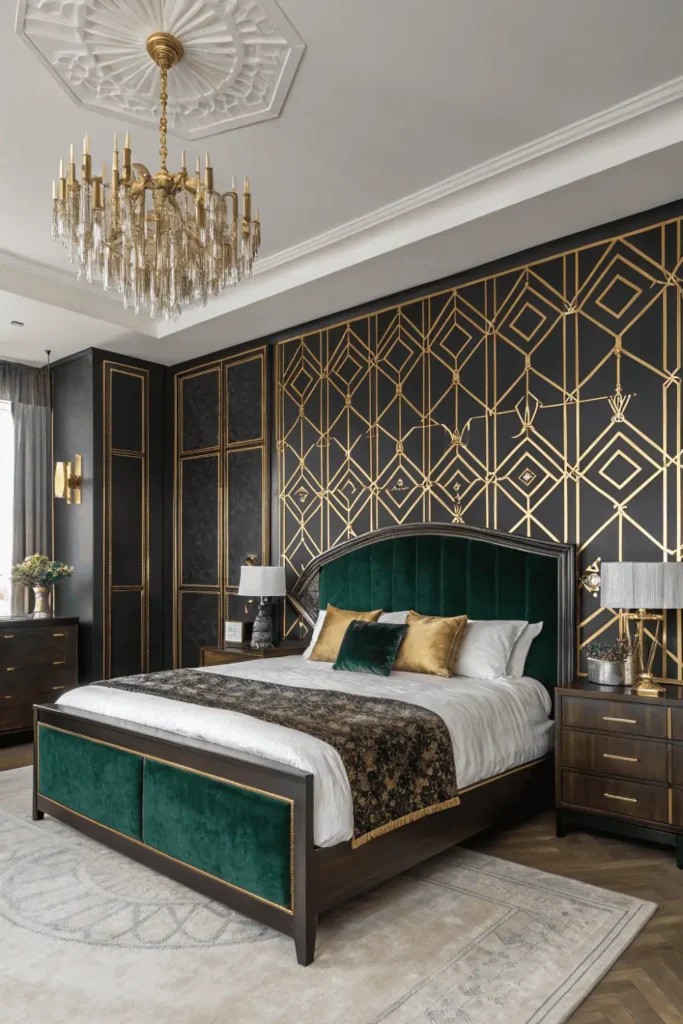 Layer in velvet upholstered furniture, mirrored nightstands, brass fixtures, and geometric wallpaper behind the bed. Choose jewel-toned bedding in emerald, sapphire, or ruby for authentic period glamour.