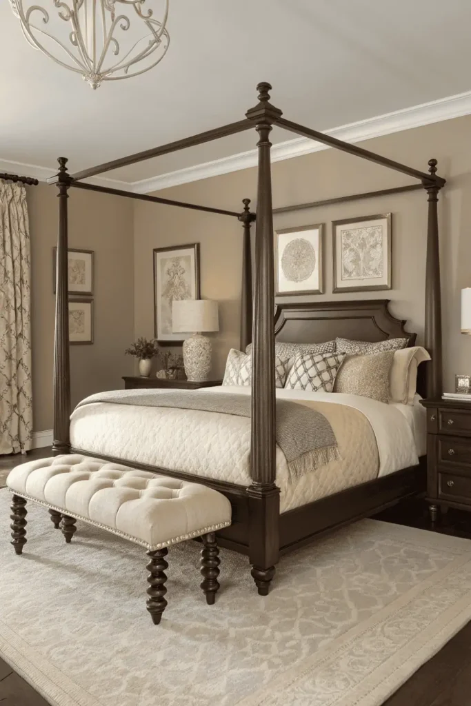 Add tufted upholstered benches, classic table lamps with neutral shades, and simple framed artwork for refined elegance. Layered area rugs in complementary neutrals add warmth and dimension to the space.