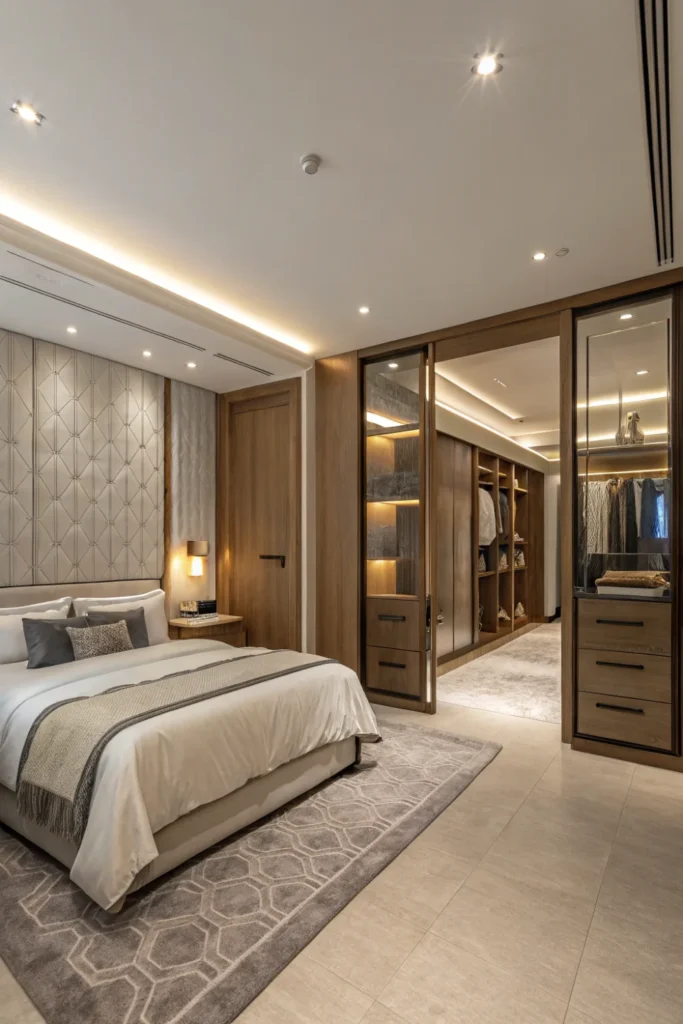 Include nightstand nooks, overhead cabinets, and display shelving on the bedroom side, while the dressing room behind houses full wardrobes and vanity space. The seamless built-in creates custom suite aesthetics.