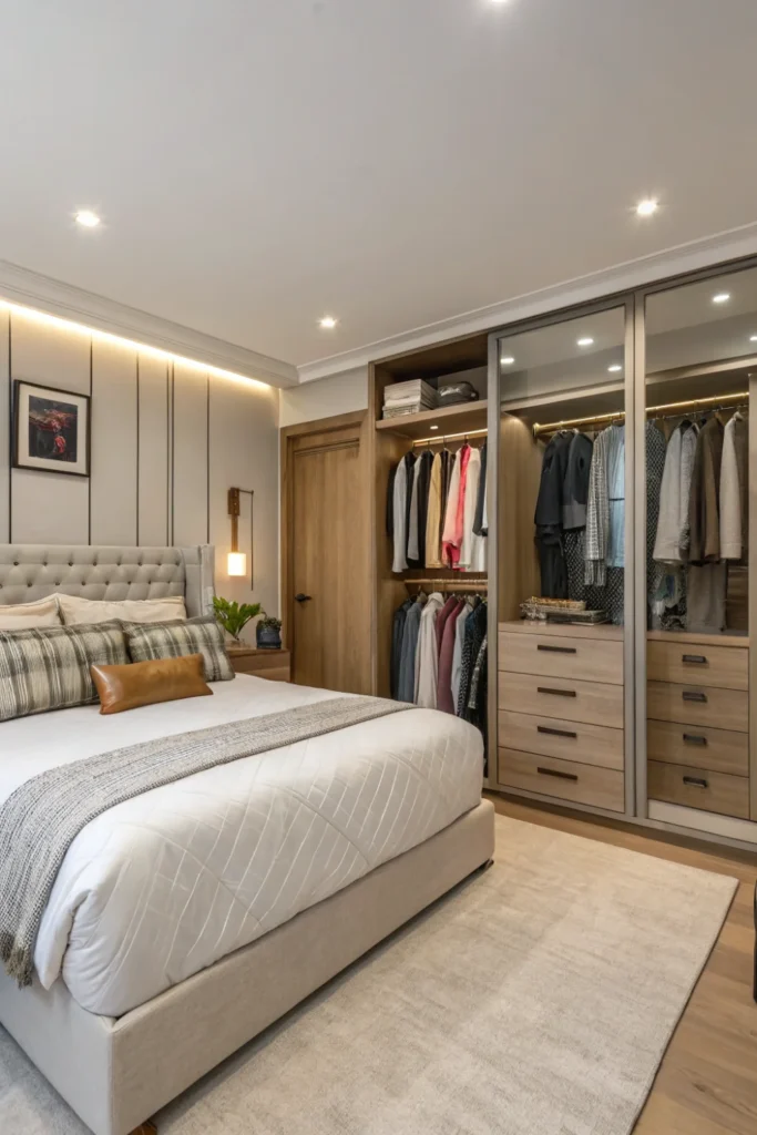 Install floor-to-ceiling wardrobes on both sides of the walkway, add recessed lighting in the ceiling, and include a built-in vanity or island if space allows. The bed acts as a natural room divider that defines sleeping from dressing zones.