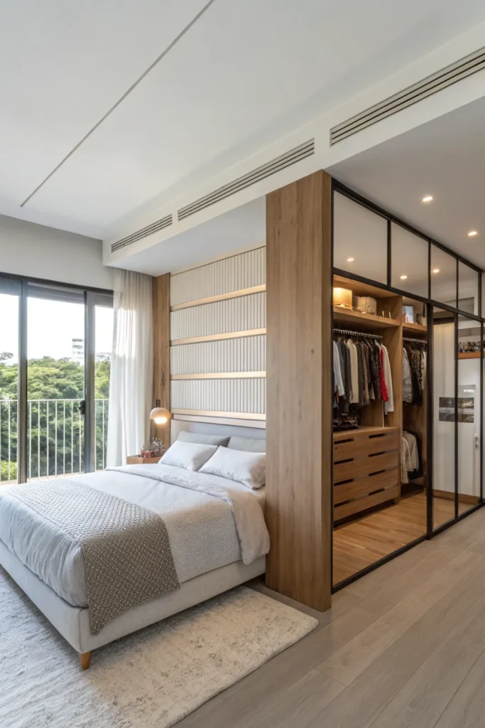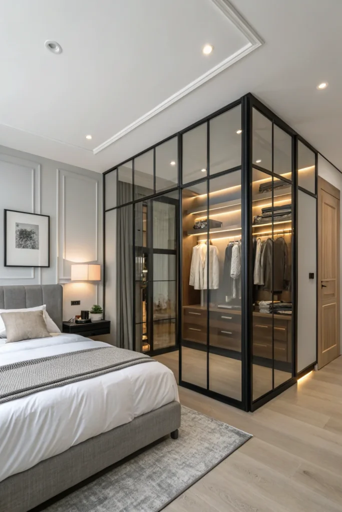 Install floor-to-ceiling glass walls or doors between your sleeping and dressing areas to create a dressing room behind bed that maintains brightness and spaciousness. This luxurious approach works beautifully in smaller bedrooms where solid walls would feel confining.