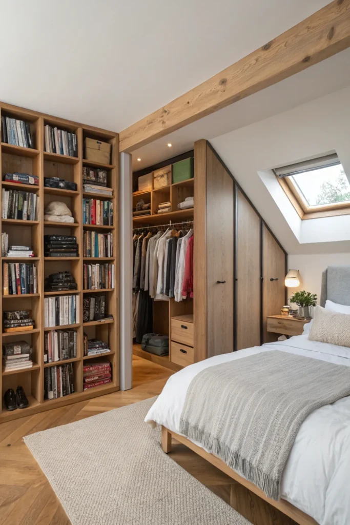 Position a tall open bookshelf or shelving unit behind your bed to create a permeable divider that defines the dressing room behind bed while maintaining visual connection. This works beautifully for those who want separation without complete enclosure.