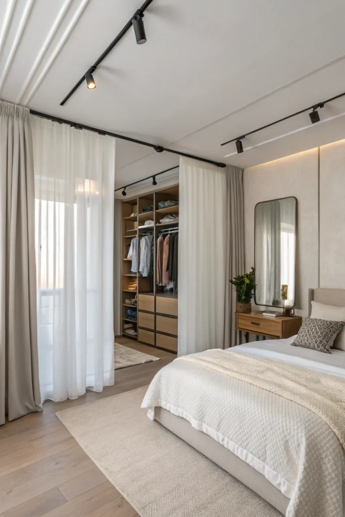 Install ceiling-mounted curtain tracks that create a soft, flexible dressing room behind bed separation you can open or close as needed. This affordable, renter-friendly solution offers maximum adaptability and easy seasonal changes.