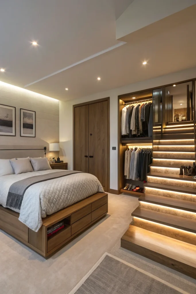 Add built-in storage drawers or cabinets in the platform structure, and use step lighting for safety when moving between levels. The elevated dressing area feels like a separate suite while remaining visually connected to the bedroom.