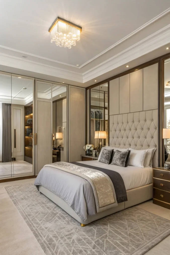 Create a hidden door within the mirrored wall that opens to reveal the dressing area, or position mirrored sliding doors that move to expose the closet. The mirrors make your bedroom feel dramatically larger while serving dual purposes.