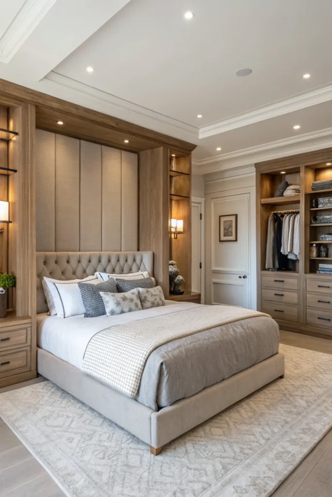 Position your bed to create an L-shaped dressing room behind bed and along one adjacent wall, maximizing storage while maintaining efficient room flow. This configuration works beautifully in square or rectangular bedrooms.