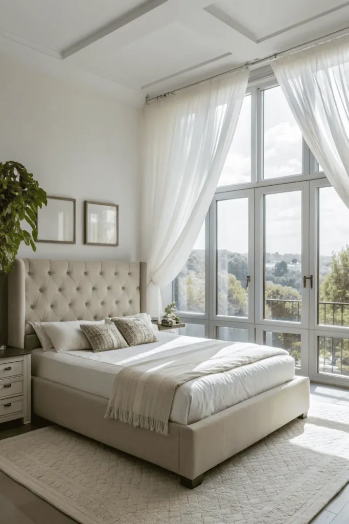 Add blackout curtains or cellular shades for light control and privacy. The simplified setup makes the room feel less crowded while the natural light behind the bed creates an airy atmosphere.