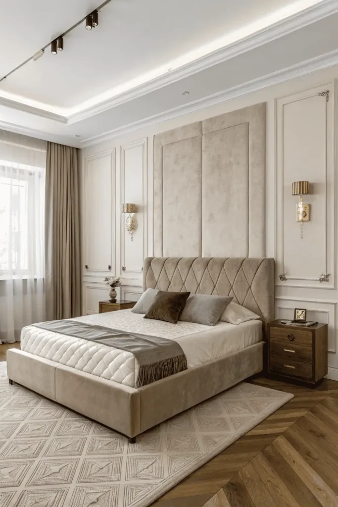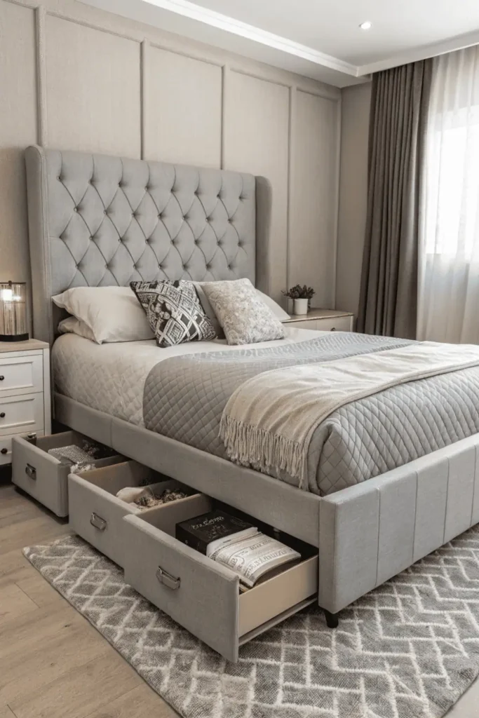An upholstered headboard bed adds luxury while remaining space-efficient when paired with the right storage solutions. Invest in matching under-bed storage bins that slide easily on wheels and keep your belongings dust-free and organized.