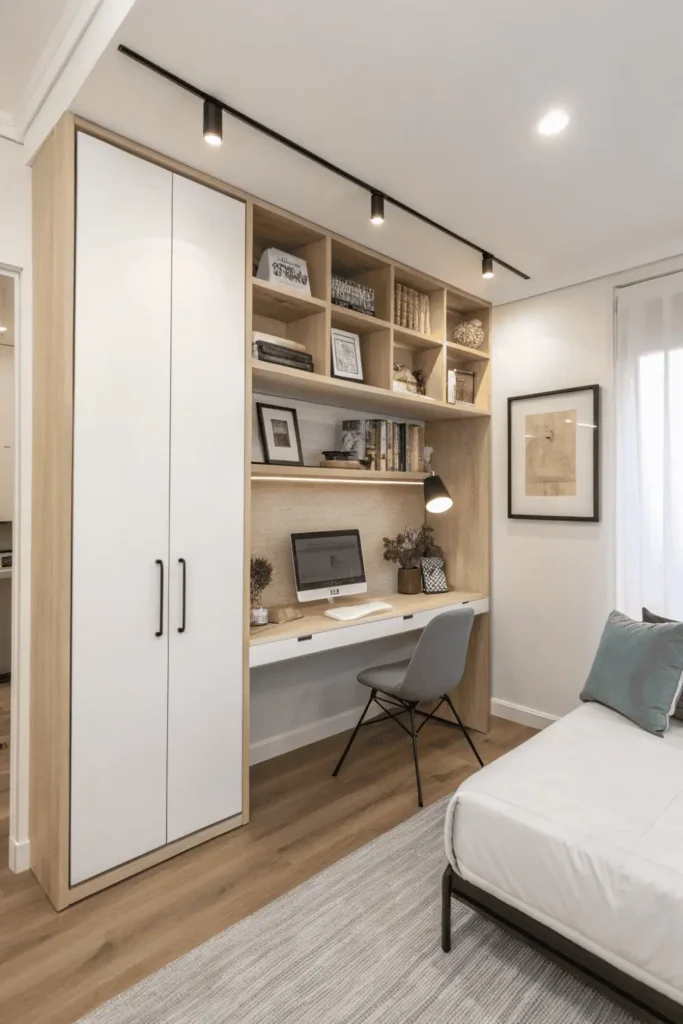 A Murphy bed system transforms your bedroom into a multi-purpose space during daytime hours. When folded up, these beds reveal built-in desks, shelving, or workspace, making them perfect for studio apartments or guest rooms that double as home offices.