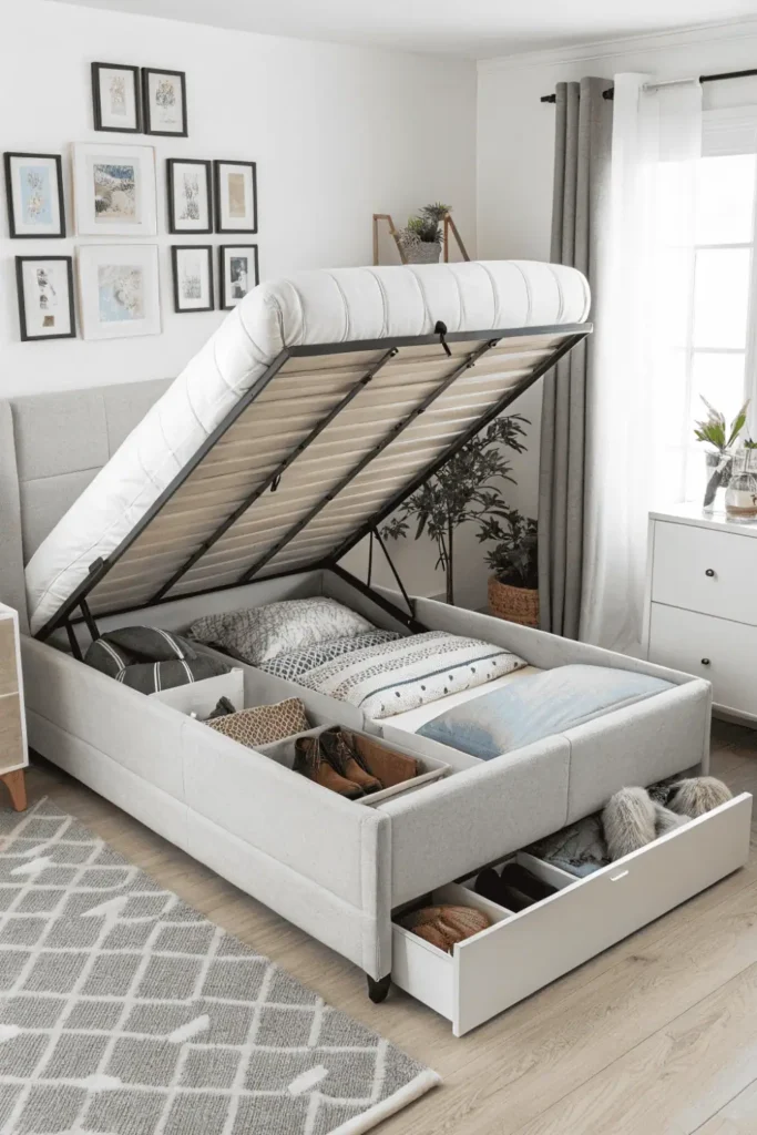 Hydraulic lift storage beds provide massive storage capacity by lifting the entire mattress platform to reveal a cavernous space underneath. This solution is perfect for storing bulky items like suitcases, extra bedding, or out-of-season clothing that you don’t need daily access to.