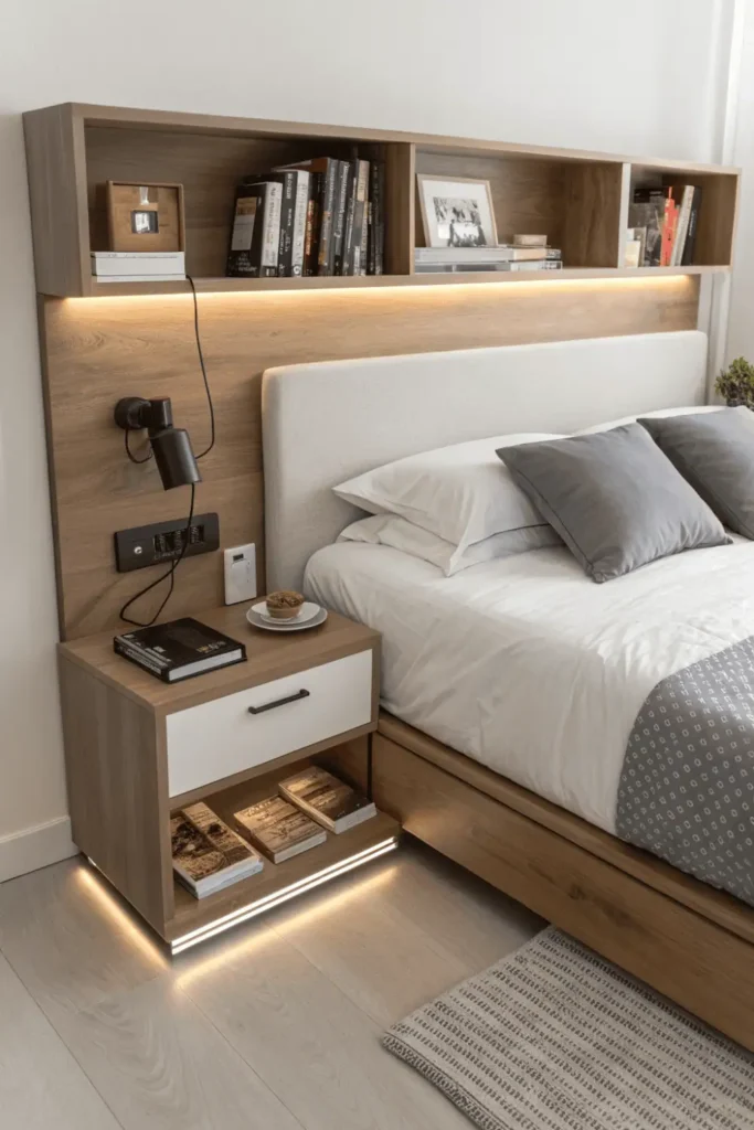 Pro Tip: Keep only essential items on the attached shelving to maintain a clean look—a small plant, alarm clock, and current book are sufficient.