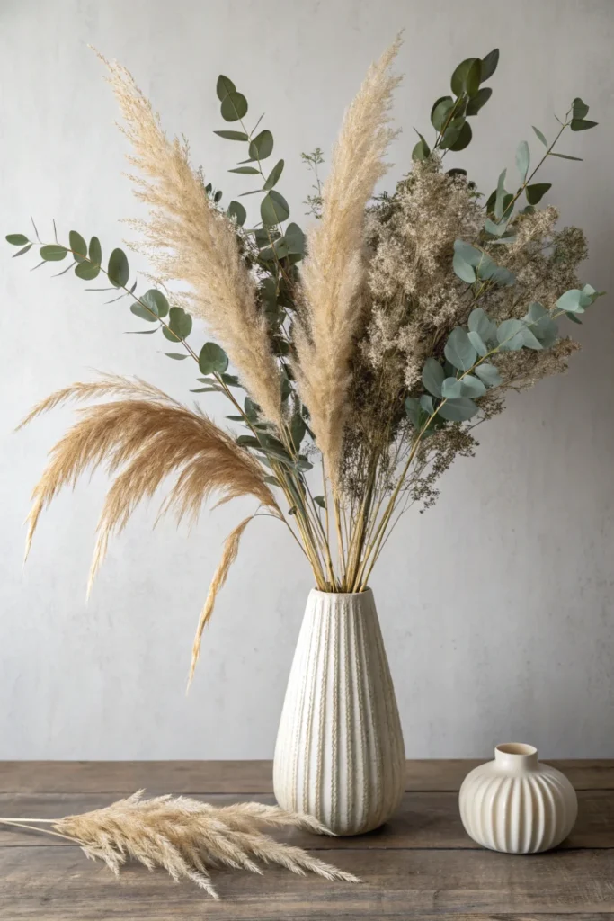 Pampas grass, wheat stalks, dried roses, or eucalyptus in complementary colors build textured bouquets. Simple vessel choices let natural materials become focal points.
