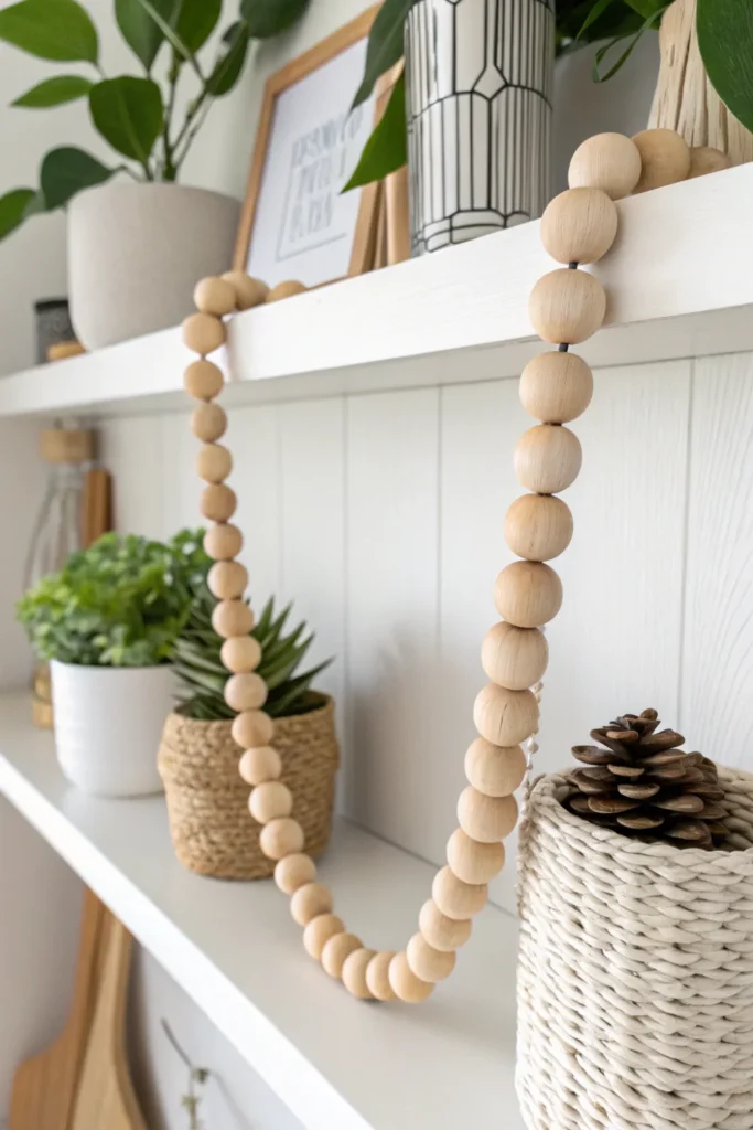 Strung natural wood beads create simple, versatile handmade home decor adding organic texture. The Scandinavian-inspired craft produces timeless pieces suiting minimalist and farmhouse styles.