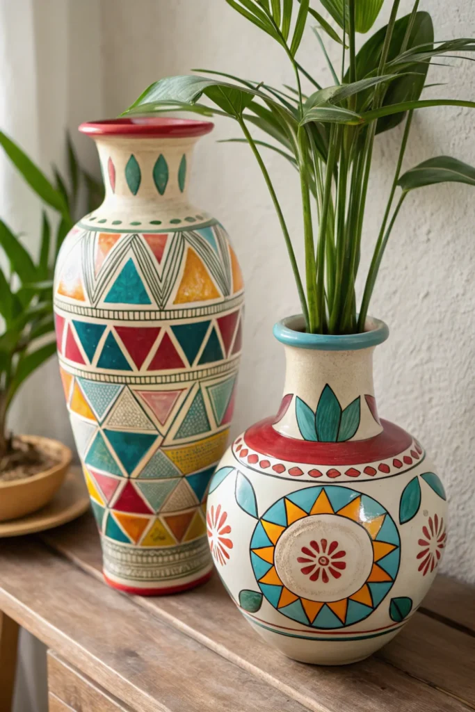 Customized vases, planters, and decorative bowls painted with personal designs create functional handmade home decor. The painted ceramics showcase individual style while serving practical purposes.