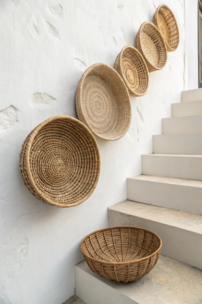 Decorative woven baskets mounted on walls create textured handmade home decor with global influence. The natural materials and varied weaving patterns add organic interest and cultural character.
