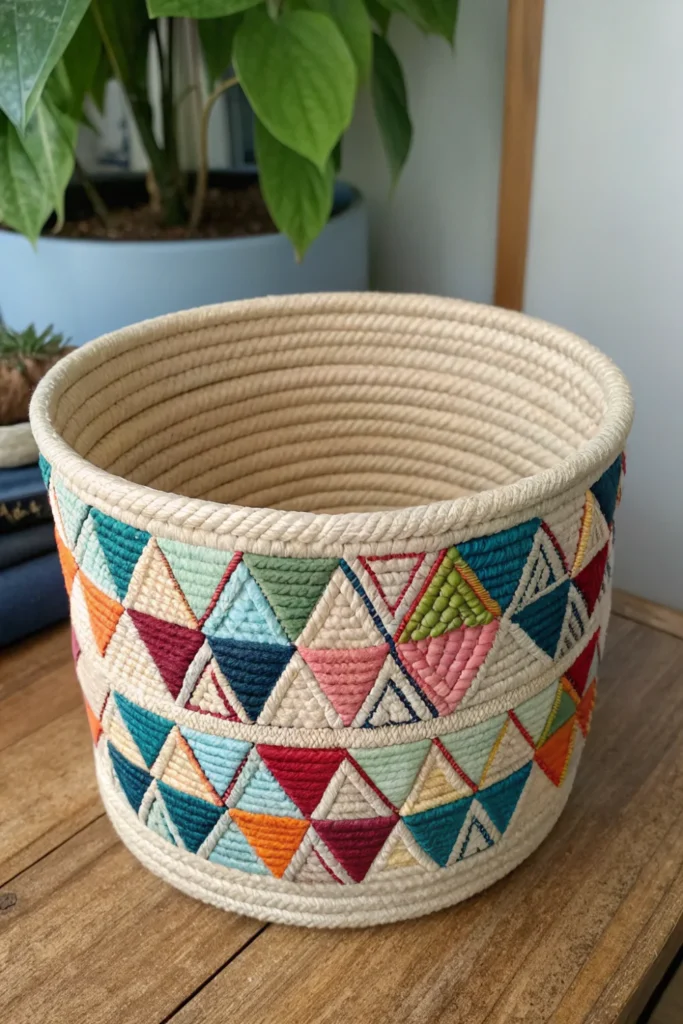 Pinterest Image Prompt: Vertical 2:3 image of coiled rope basket with colorful thread stitching, geometric pattern, functional handmade home decor, storage vessel, handcrafted and useful, organized beauty, textured container