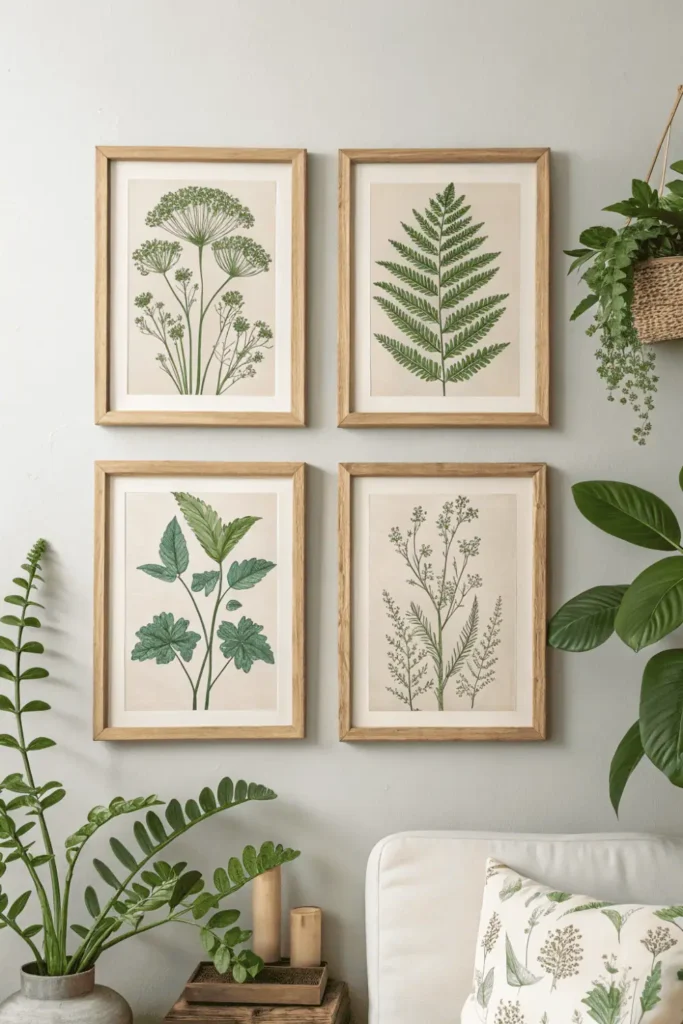 Vintage botanical illustrations suit traditional spaces while modern plant photography enhances contemporary rooms. Green tones promote calm and connect interiors with nature.
