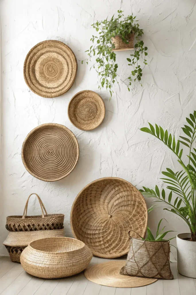 Grouping decorative baskets on walls creates textured home wall decor with global or bohemian flair. The unexpected display adds dimension and organic interest.