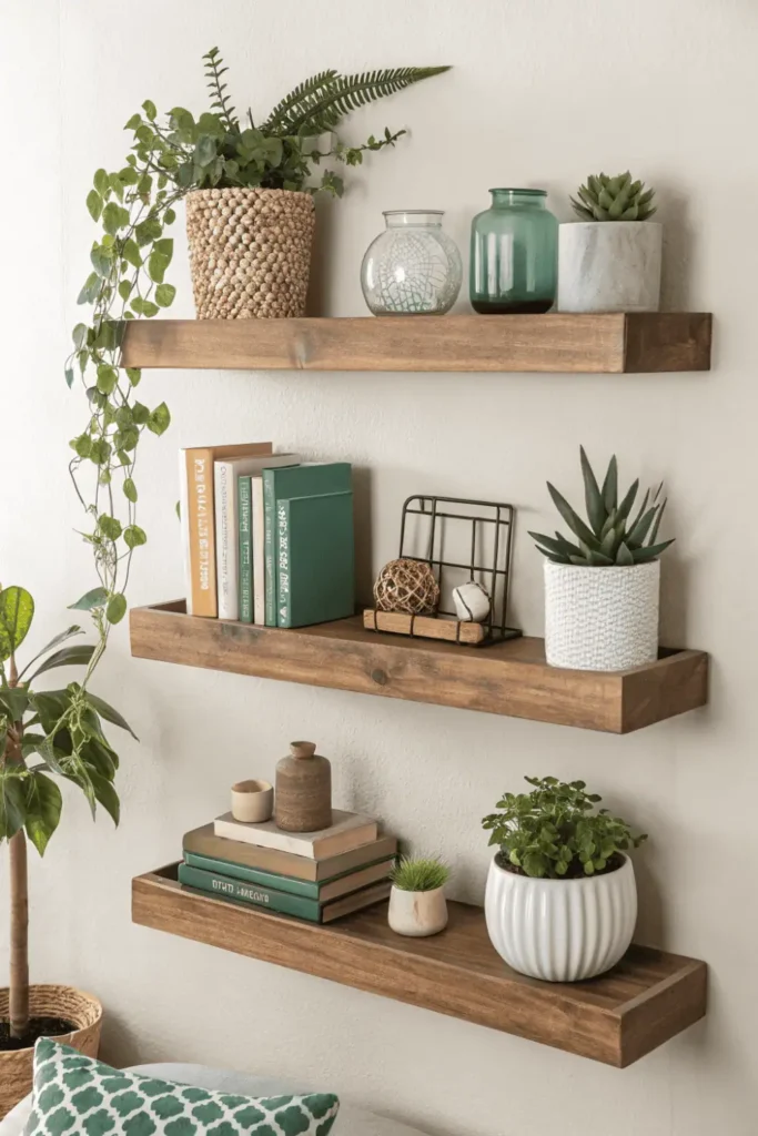 Pro Tip: Style floating shelves using the triangle rule—group objects in sets of three with varying heights, and include a mix of books, plants, and decorative items for balanced home wall decor displays.