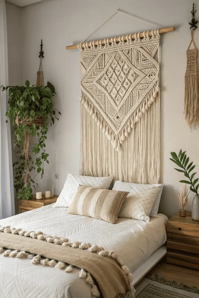 Macramé, woven textiles, or fiber art adds soft dimensional home wall decor with bohemian or global influence. The handcrafted pieces introduce texture and warmth beyond flat surfaces.