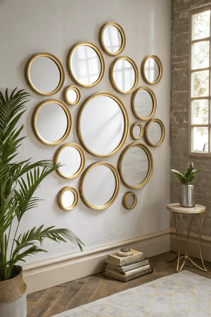Grouping multiple small mirrors creates gallery-like displays. Oversized statement mirrors anchor walls dramatically. Sunburst, geometric, or ornate frames suit different aesthetics.