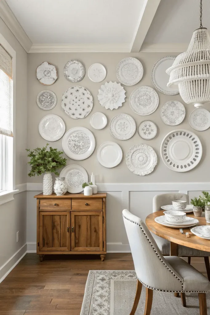 Decorative plates, vintage dishes, or ceramic art arranged on walls creates unique home wall decor with global or vintage charm. The unexpected display transforms functional objects into wall art.