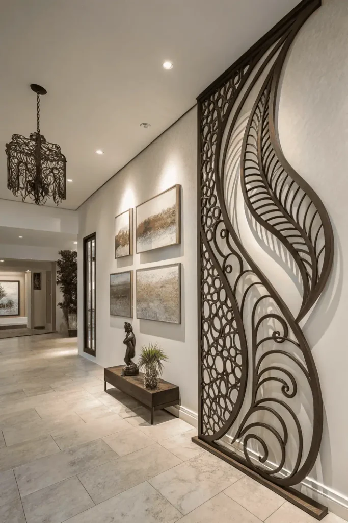 Abstract metal designs, carved wood panels, or ceramic tile arrangements suit contemporary spaces. Nature-inspired motifs or geometric patterns accommodate various aesthetics.