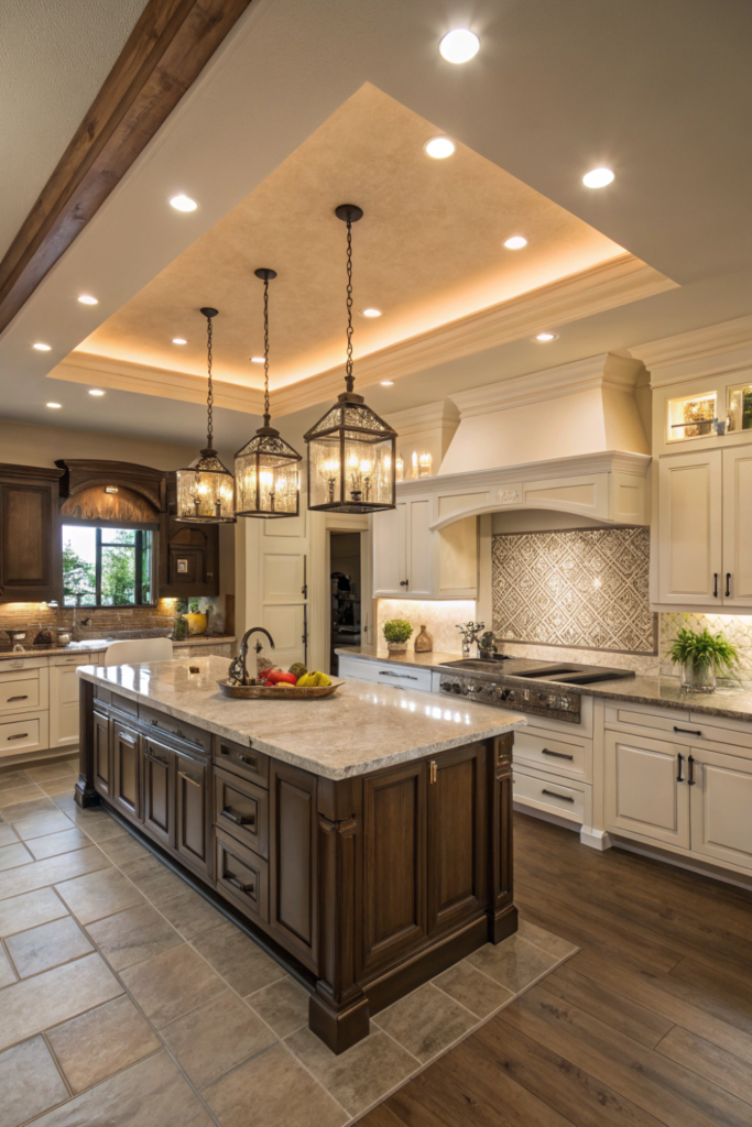 Decorative chandeliers over dining areas or large islands create dramatic kitchen lighting focal points. The substantial fixtures add elegance and personality while providing necessary illumination.