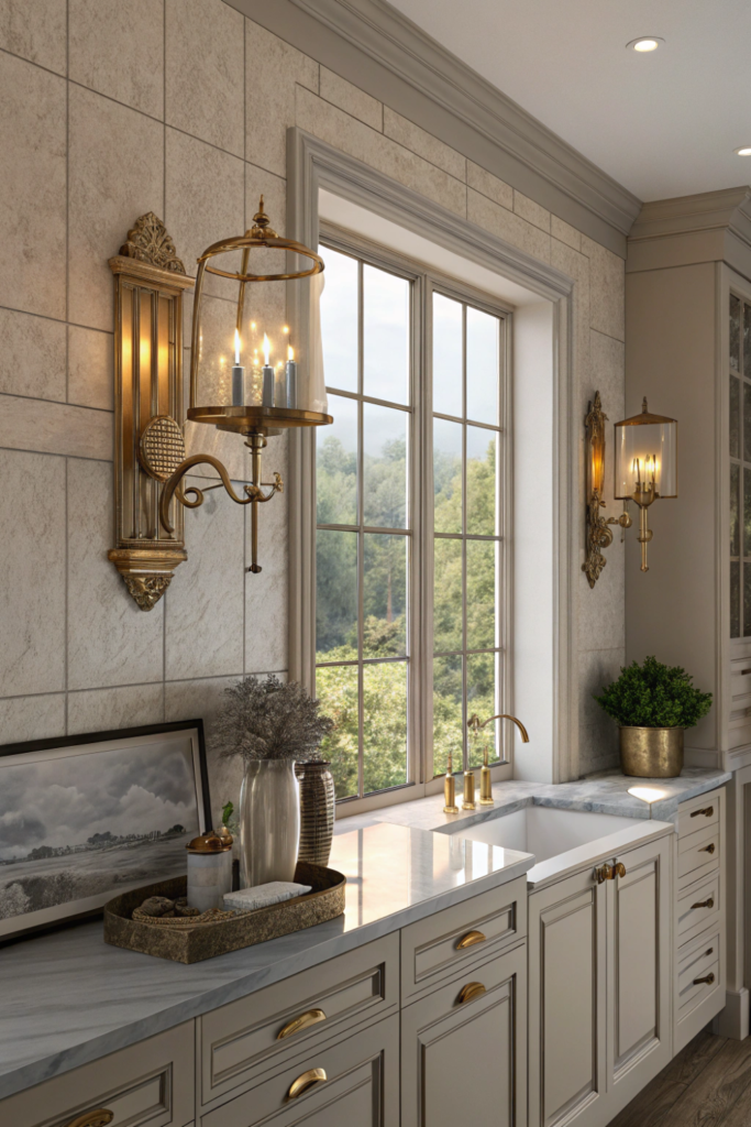 Wall-mounted sconces flanking windows, artwork, or open shelving provide accent kitchen lighting adding dimension and visual interest. The decorative fixtures create layers beyond ceiling illumination.