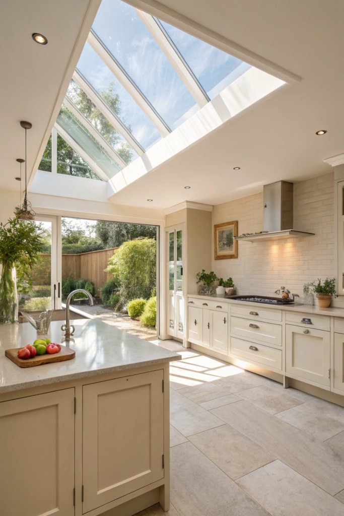 Natural light from above supplements artificial kitchen lighting while reducing daytime energy consumption. The overhead illumination creates bright, cheerful atmospheres connecting interiors with outdoors.