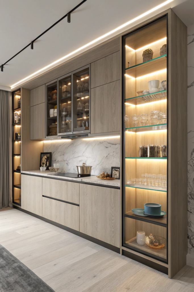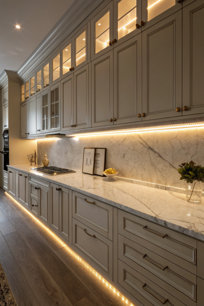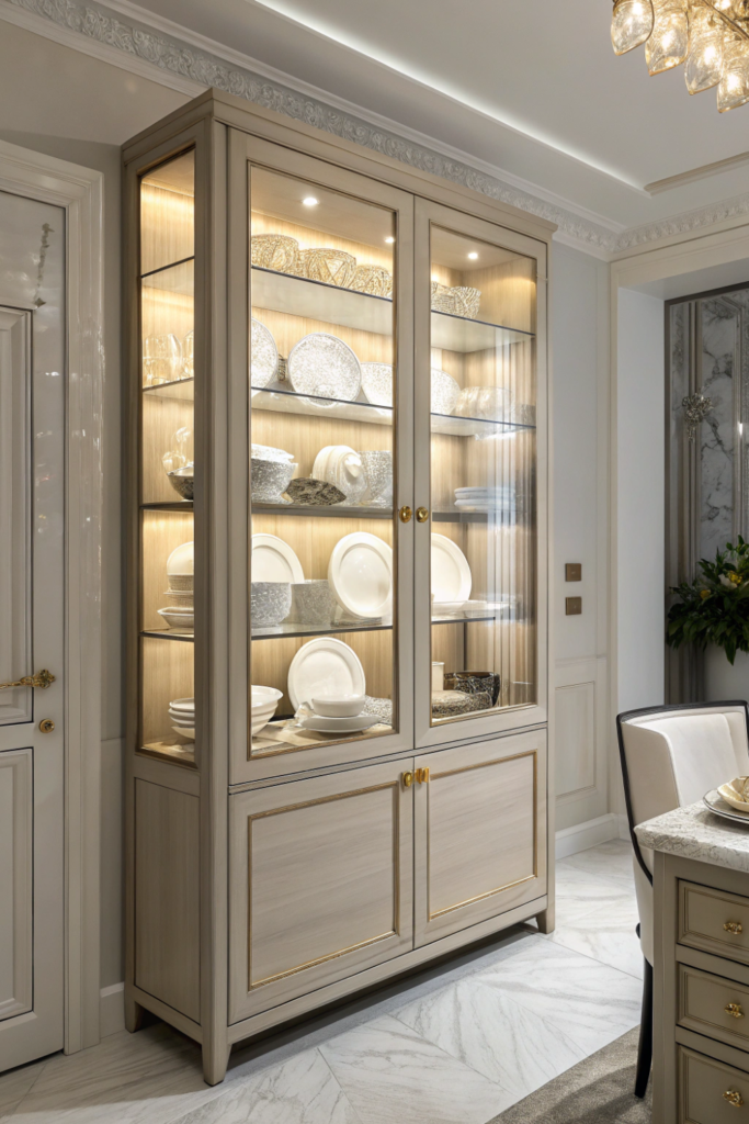 LED strips or puck lights inside glass-front cabinets illuminate displays while providing functional kitchen lighting for locating items. The integrated illumination showcases beautiful dishware.