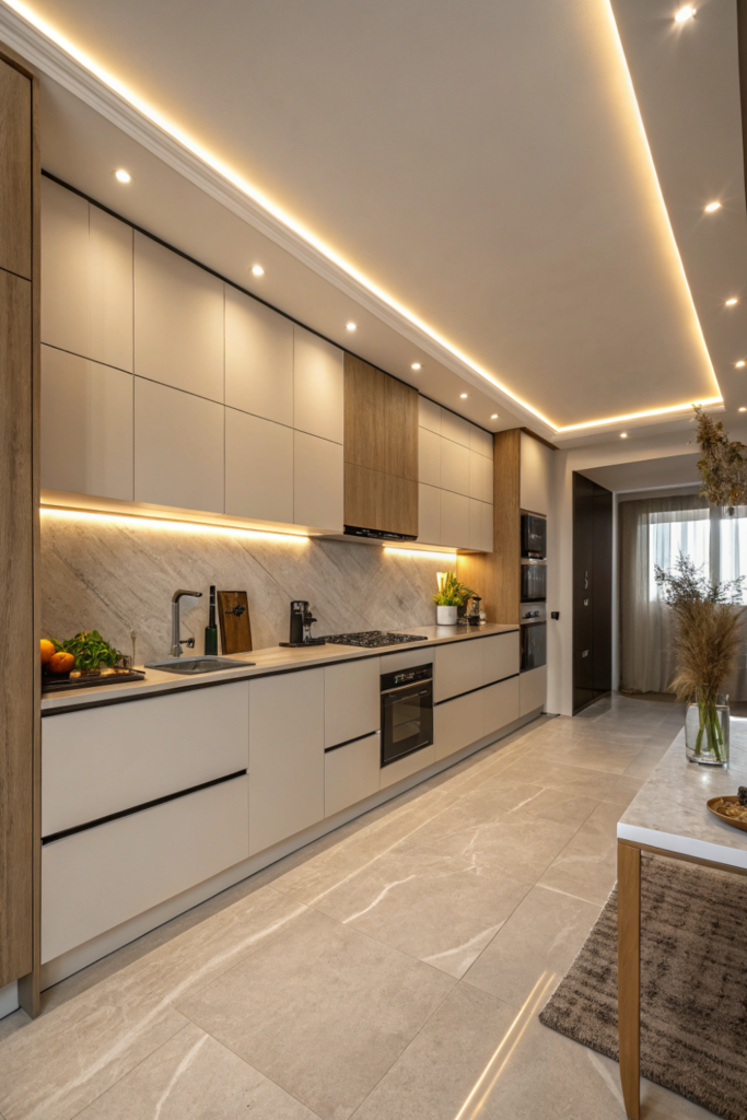 Hidden LED strips above cabinets or in ceiling coves create ambient kitchen lighting through indirect, reflected illumination. The soft uplight adds warmth without harsh glare.