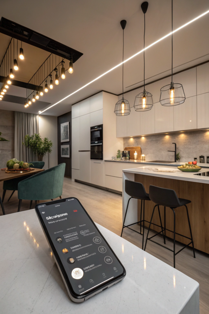 Pinterest Image Prompt: Vertical image of modern kitchen with smart lighting controlled by phone/tablet, adjustable scenes, intelligent kitchen lighting system, customizable ambiance, voice or app controlled, contemporary technology