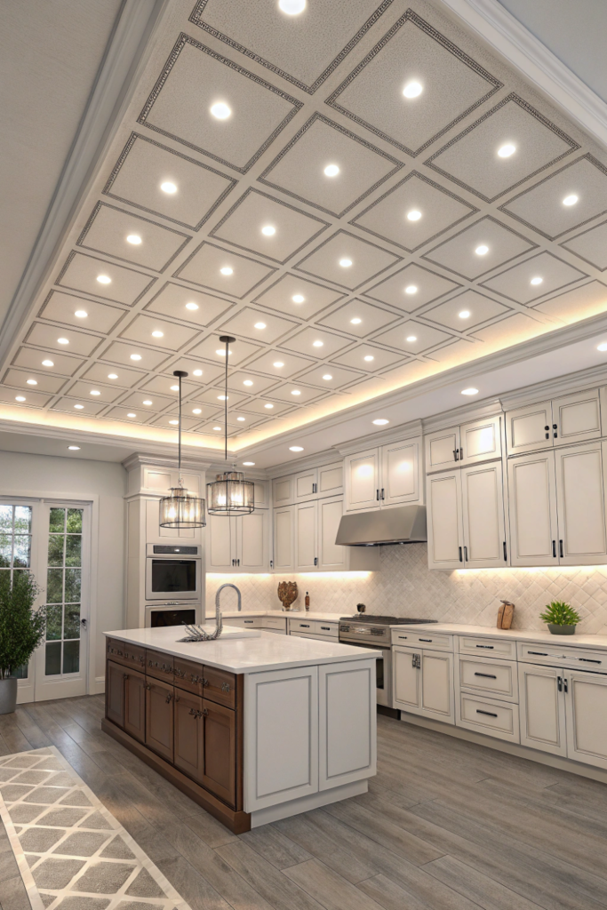 The architectural detail makes ceilings appear taller while adding dimensional glow. Warm white LEDs create cozy atmosphere enhancing kitchen comfort.