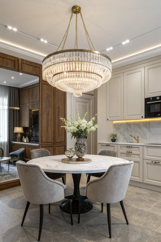 Pro Tip: Install chandeliers on dimmers in your kitchen lighting scheme to adjust from bright task lighting during meal prep to soft ambient glow during dining for maximum versatility.