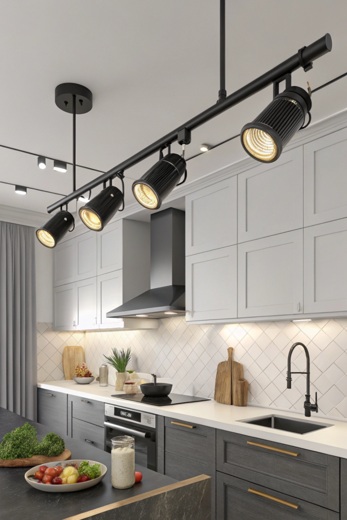 Modern low-profile tracks suit contemporary kitchens while cable systems offer industrial edge. Mix spotlight and flood bulbs for varied illumination types.