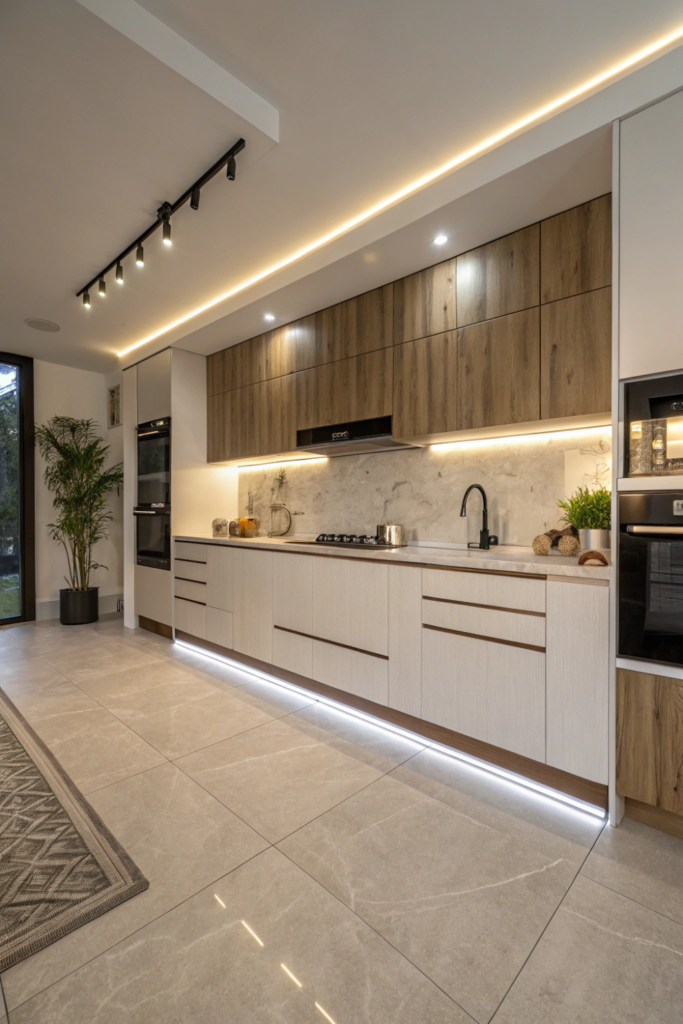 LED strips installed at cabinet base create subtle ambient kitchen lighting while improving safety through floor-level illumination. The unexpected placement adds modern sophistication.