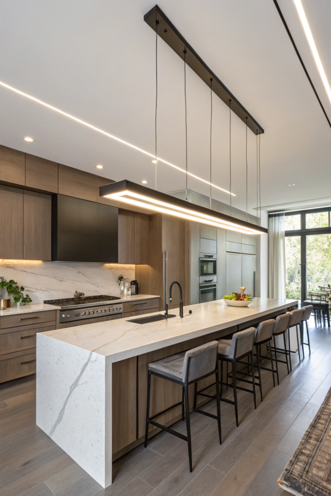 | Linear Suspended | Task/Decorative – modern | Over islands/tables | $$$-$$$$ | Medium – ceiling mount | Very High – architectural |