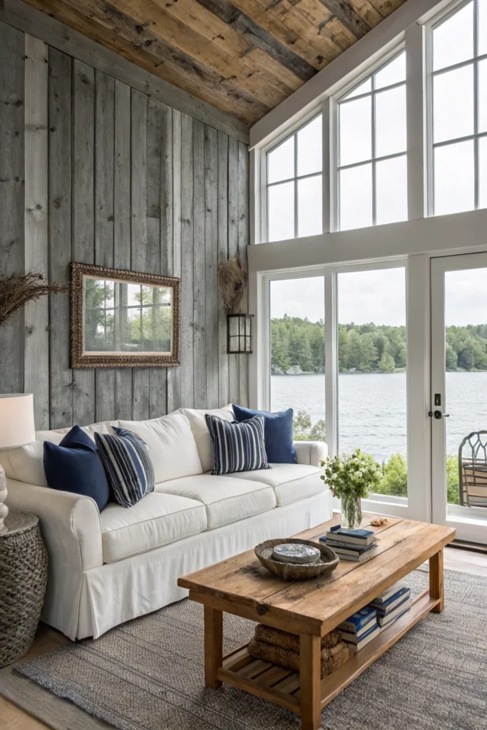 Transform your walls with reclaimed barnwood paneling or whitewashed shiplap that captures the essence of lakeside living. These textured surfaces add instant character and warmth while creating the perfect backdrop for your lake house decor.