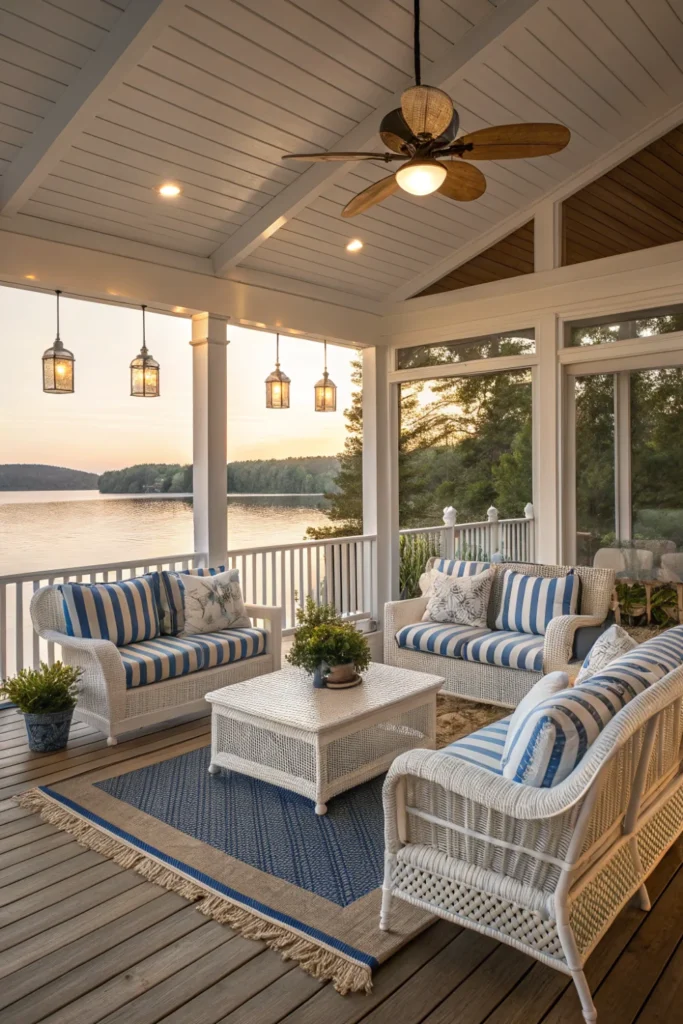 Extend your living area with a fully furnished screened porch that serves as an outdoor room during warm months. This essential lake house decor element provides bug-free comfort while maintaining connection to breezes, sounds, and views.