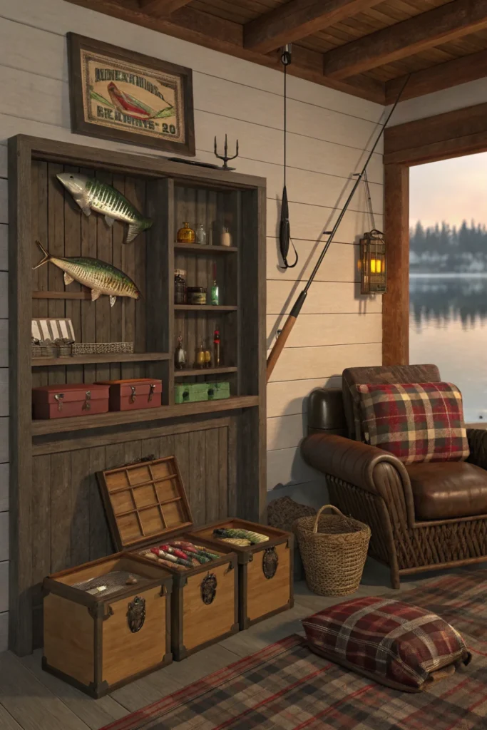 Create shadow boxes with organized lure collections or frame vintage fishing licenses and lake permits from different decades. Display wooden oars, vintage life preservers, or historic photos of fishing tournaments in casual arrangements.