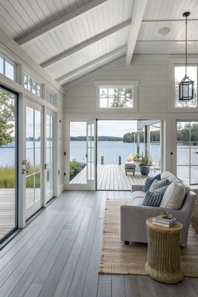 Install wide-plank wood flooring in weathered or gray-washed finishes that mimic the look of dock planking throughout your lake house decor scheme. This design choice creates continuity between indoor and outdoor spaces while embracing casual, durable style.