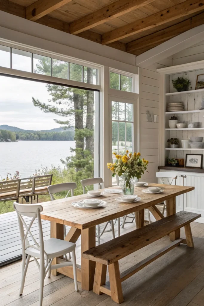 Design relaxed dining areas with farmhouse tables, bench seating, and mismatched chairs that accommodate fluctuating guest counts common in lake house living. This approachable lake house decor style prioritizes function and fellowship over formal elegance.