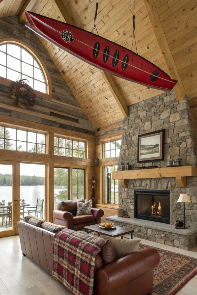 Turn retired canoes, kayaks, or rowboats into statement pieces by mounting them on walls or suspending them from ceilings. This bold lake house decor approach celebrates waterfront activities while adding dramatic visual impact.