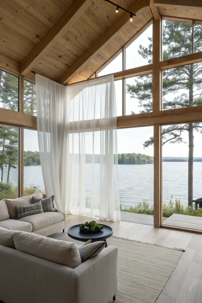 When privacy is needed, choose sheer curtains, natural woven shades, or plantation shutters that can be adjusted without completely blocking your connection to nature. Avoid heavy drapes that compete with the view.