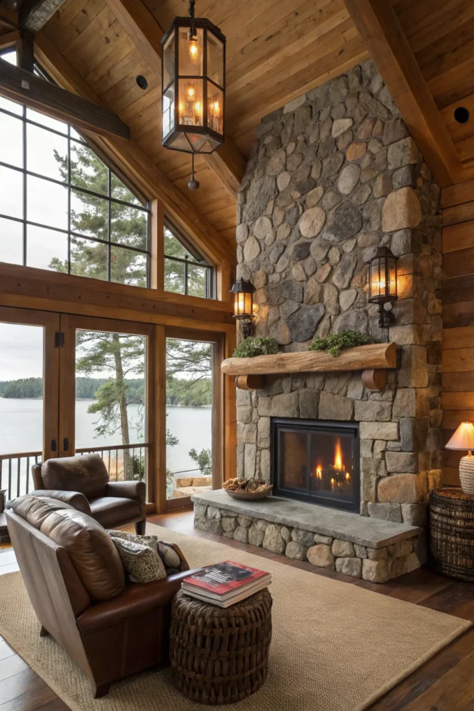 Anchor your main living space with a stacked stone or river rock fireplace that brings natural texture and warmth to lake house decor. Choose local stone whenever possible to connect your interior design to the surrounding landscape.