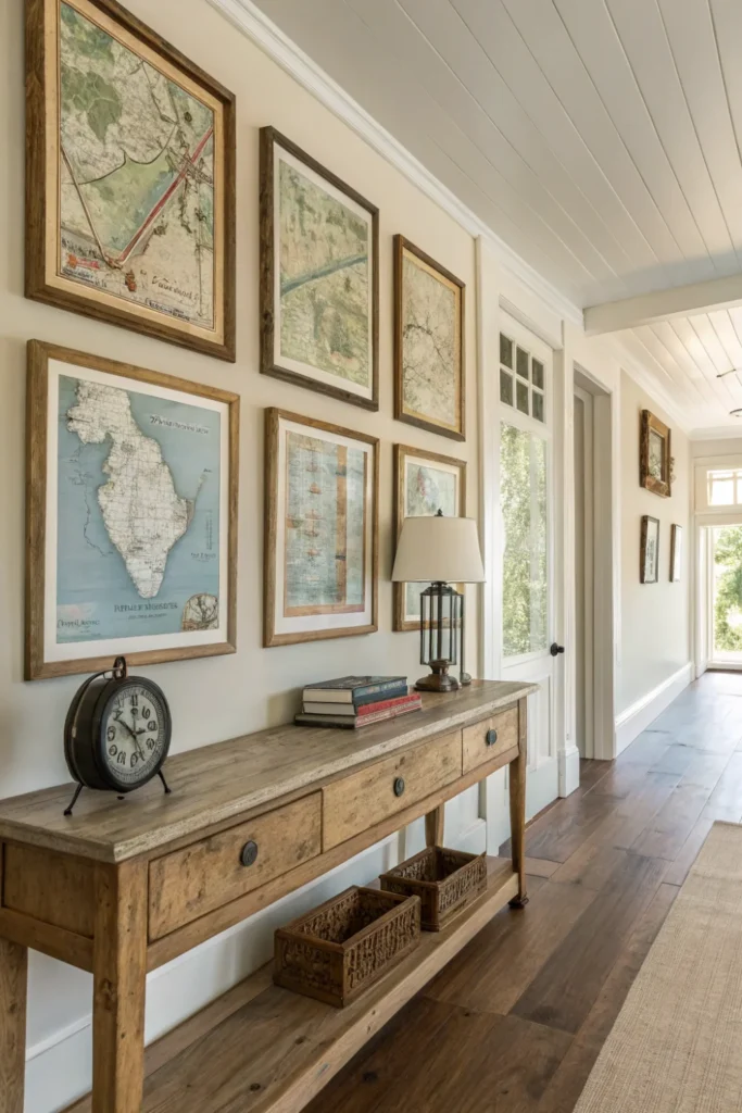Frame maps in simple wood or weathered metal frames and arrange them asymmetrically for relaxed, collected appeal. Include a highlighted “You Are Here” marker or frame a custom map showing your exact property location.