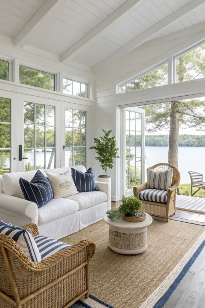 Embrace your waterfront location with floor-to-ceiling windows and minimal window treatments that frame lake views like living artwork. This fundamental lake house decor principle brings the outdoors in while flooding spaces with natural light.
