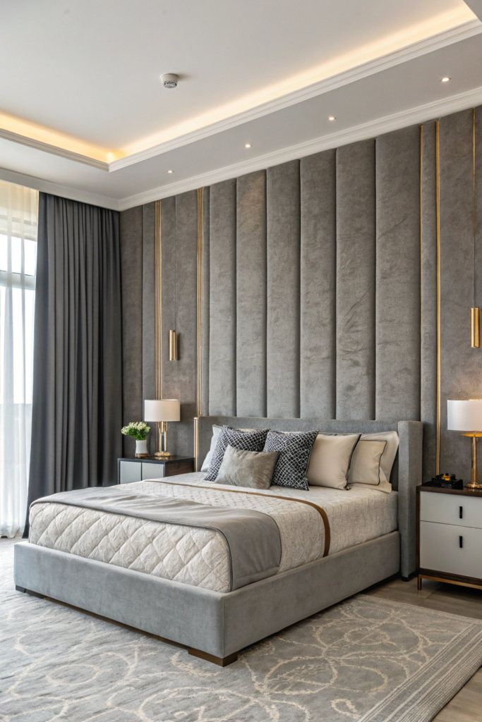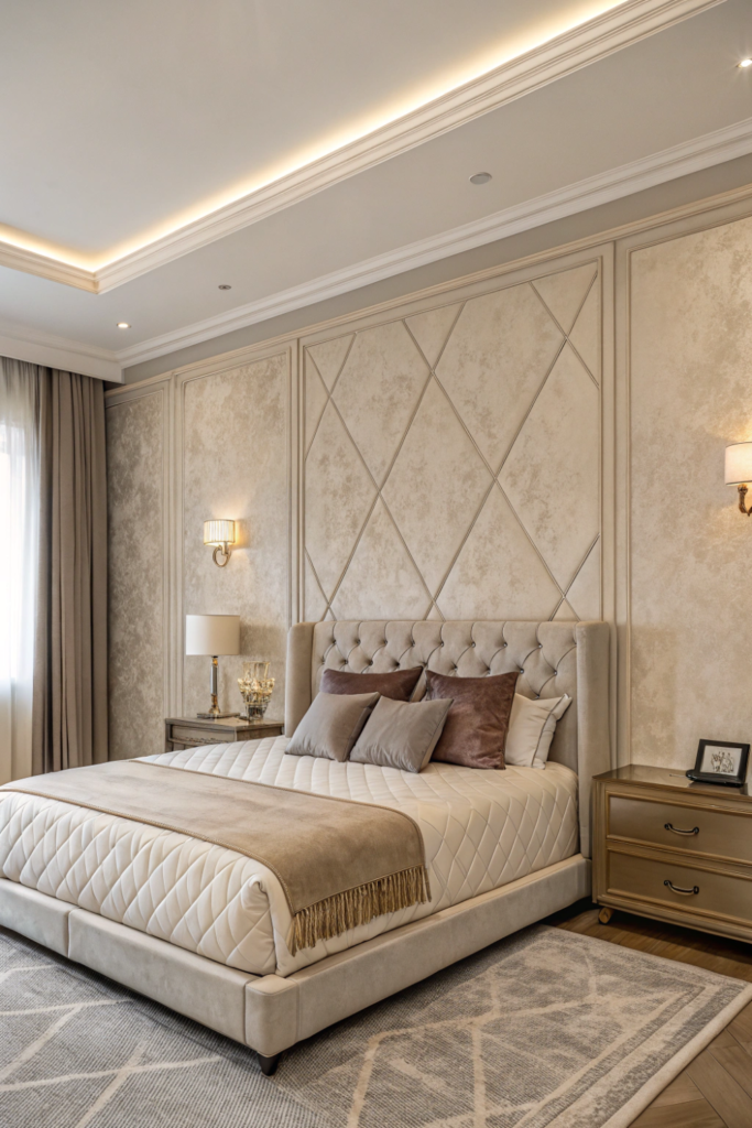 Pro Tip: Paint paneled walls in semi-gloss or satin finishes rather than matte to emphasize dimensional shadows and highlights in your master room bed back wall design bedroom.