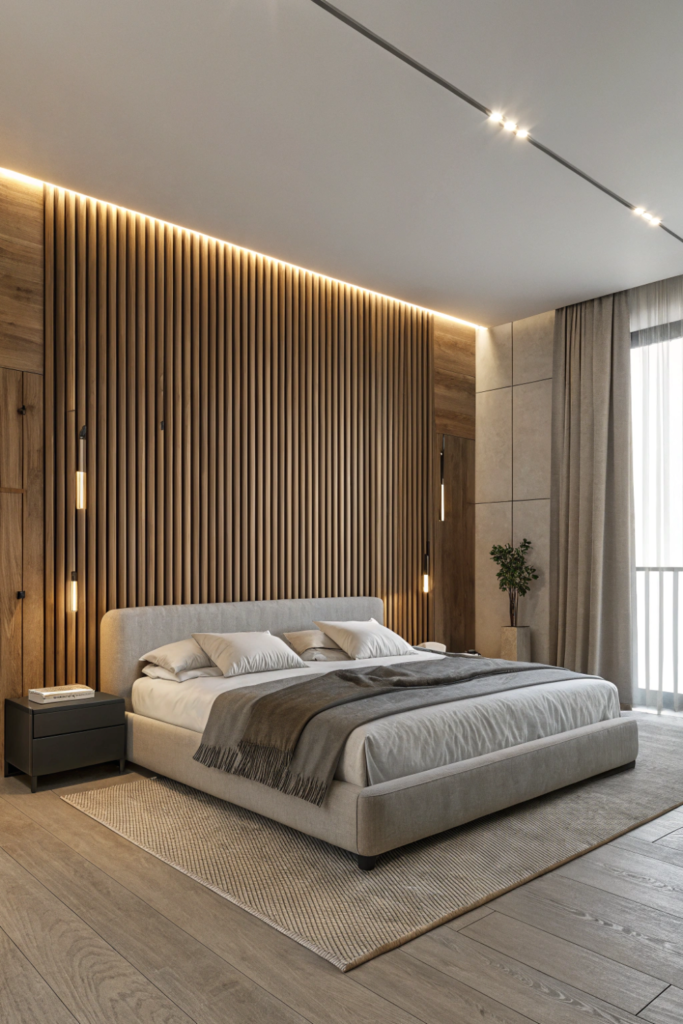 Vertical or horizontal wooden slats with gaps between create modern master room bed back wall design bedroom with dimensional interest. The linear design adds rhythm and texture through repetition.